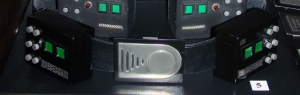 Belt Boxes: 4 1/2"(length)x3 1/8"(height)x2"(depth) Metal, lid over the front, secured on sides with small screws. Mesh - front speaker cover from Telefunken Magnetophon Series 200, Models 200, 201, 203, 210, 230 in TS and Deluxe versions. Red lights - 8mm Sylvania flat red lens and chrome bezel. Green lights - Sloan Optoelectronics 10mm square front mount indicator lights. Metal nuts - push control buttons from a Barco Remote Controlled Video/Data Selector RCVDS 400. |