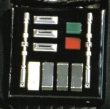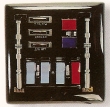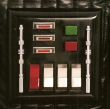 Square panels: Blue (above), red (below). Both unlit. One small aluminum switch is positioned between them.